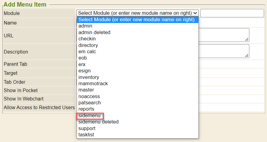 1. Click on the drop-down for Module and select sidemenu