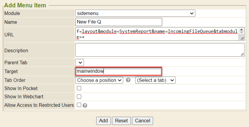 1. Add the URL - ?f=layout&module=SystemReport&name=IncomingFileQueue&tabmodule=+