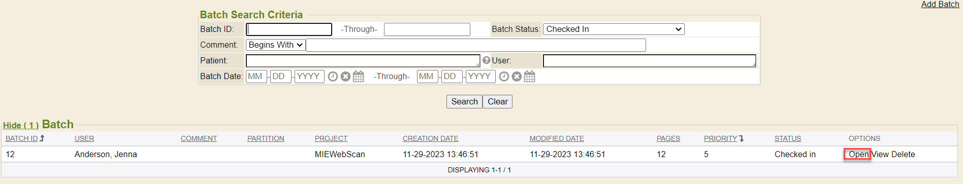 1. Go to Webscan to then index the batch by clicking Open