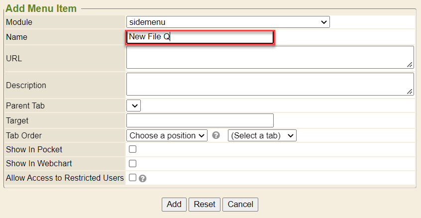 1. Click on the Tab Order drop downs to set where the New File Q option will be located on the sidemenu